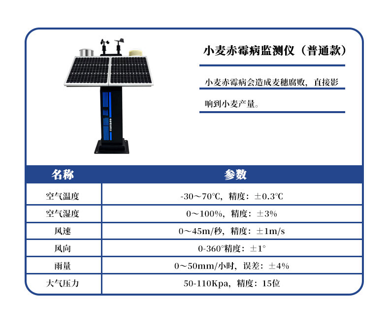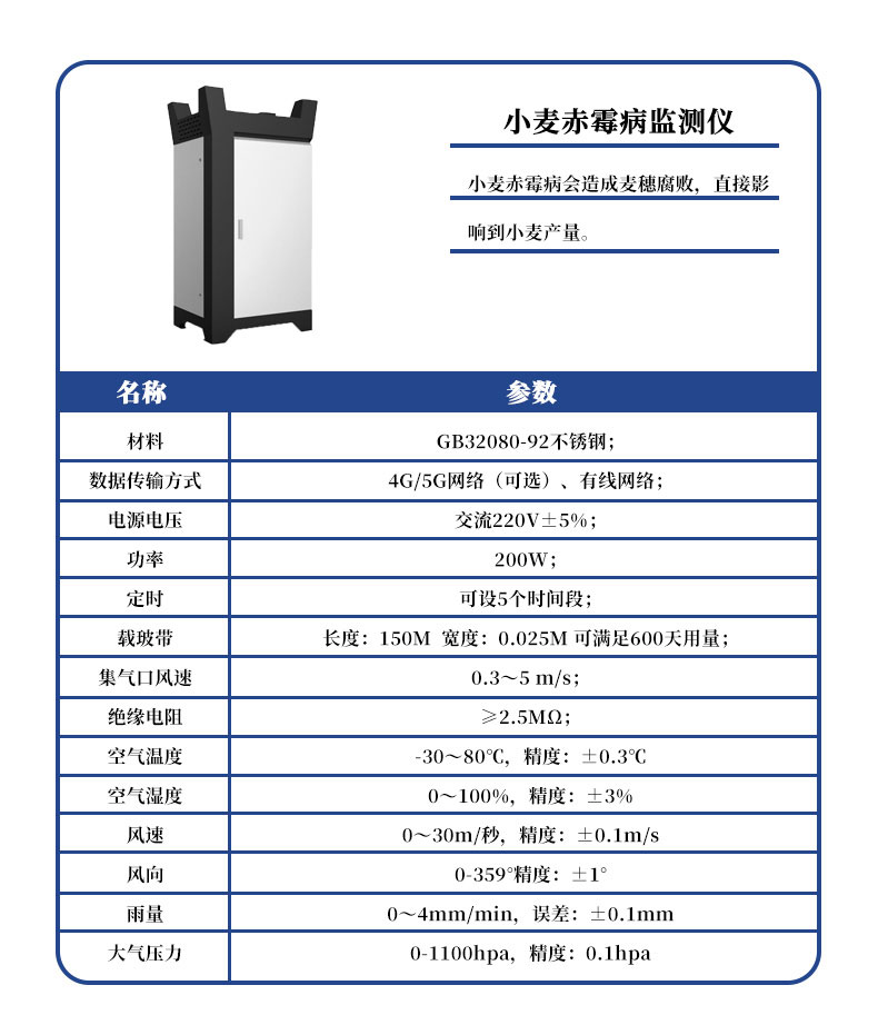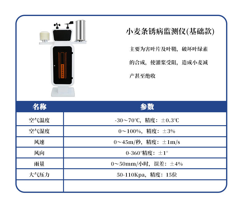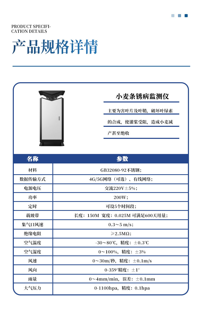 【产品简介】一、小麦条锈病监测仪简介小麦条锈病主要为害叶片及叶鞘,破坏叶绿素的合成,使灌浆受阻,造成小麦减产甚至绝收。小麦条锈病监测仪是集气象监测和智能孢子捕捉显微成像于一体的新型条锈病监测装···