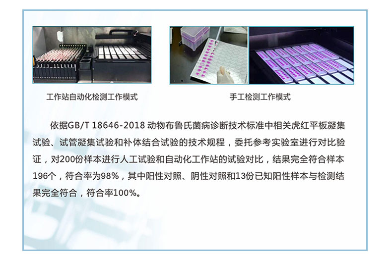 【产品简介】一、全自动布病检测工作站系统原理、规格1.采用布鲁氏杆菌检测方法学国标检测法中虎红平板凝集试验、结合机械手臂自动添加样本、虎红抗原、智能涡轮混匀系统、AI图像识别、专用软件分析系统···