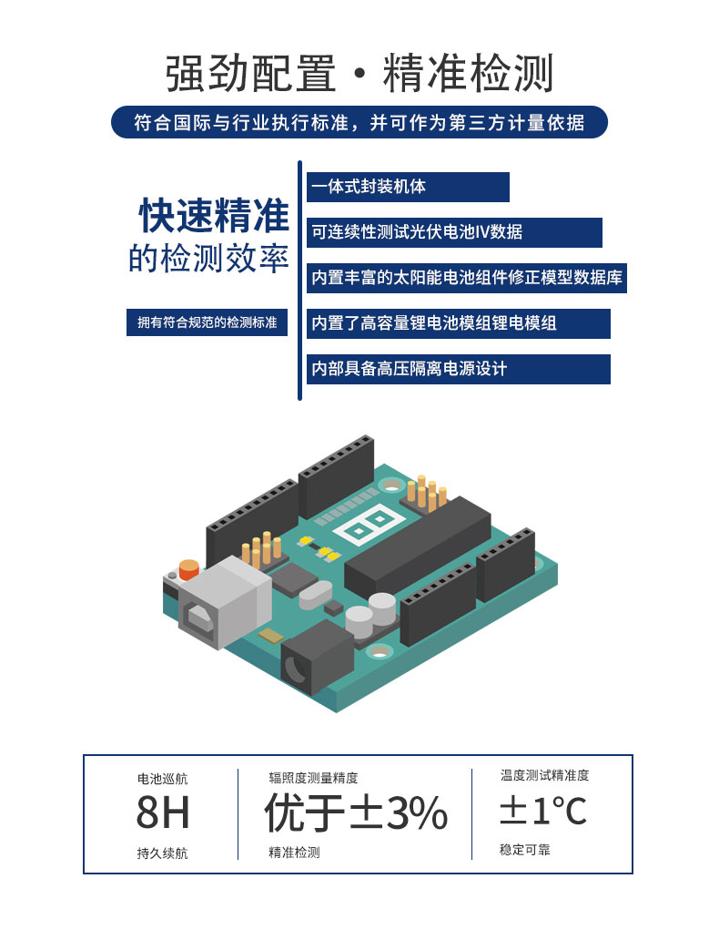 【产品简介】一、便携式iv测试仪产品简介产品为便携式iv测试仪,电压测试可达到1500V,电流测试可达20A,能够测试30kW的光伏组件。可以测试太阳能电池组件/方阵的开路电压、短路电流、最大···