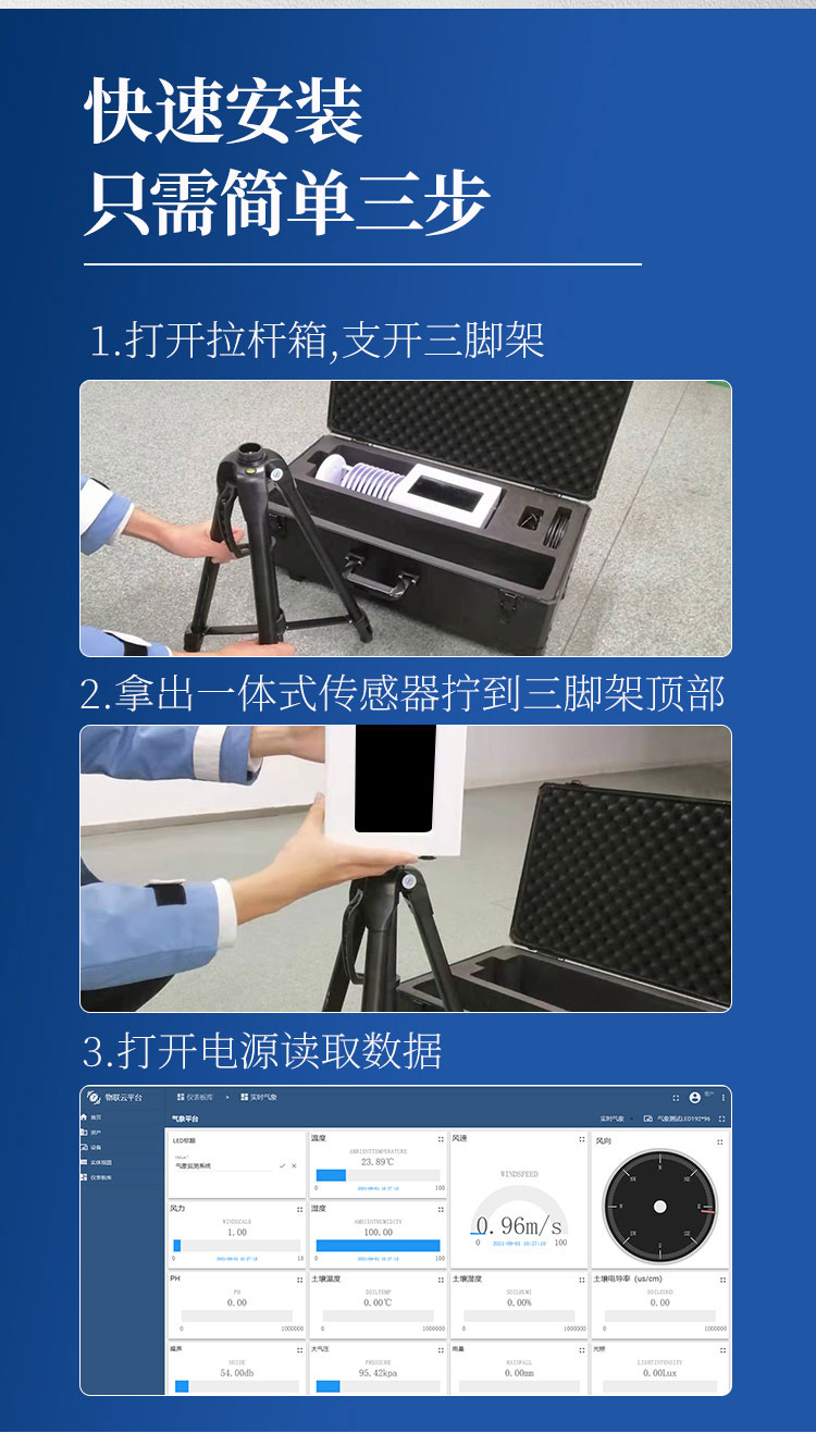 该设备支持无线传输,免调试,可快速布置,适用于各类应急气象短期观测、移动气象监测等气象数据的获取。广泛运用于气象、农林、环保、海洋、机场、港口、科学考察、校园教育等领域