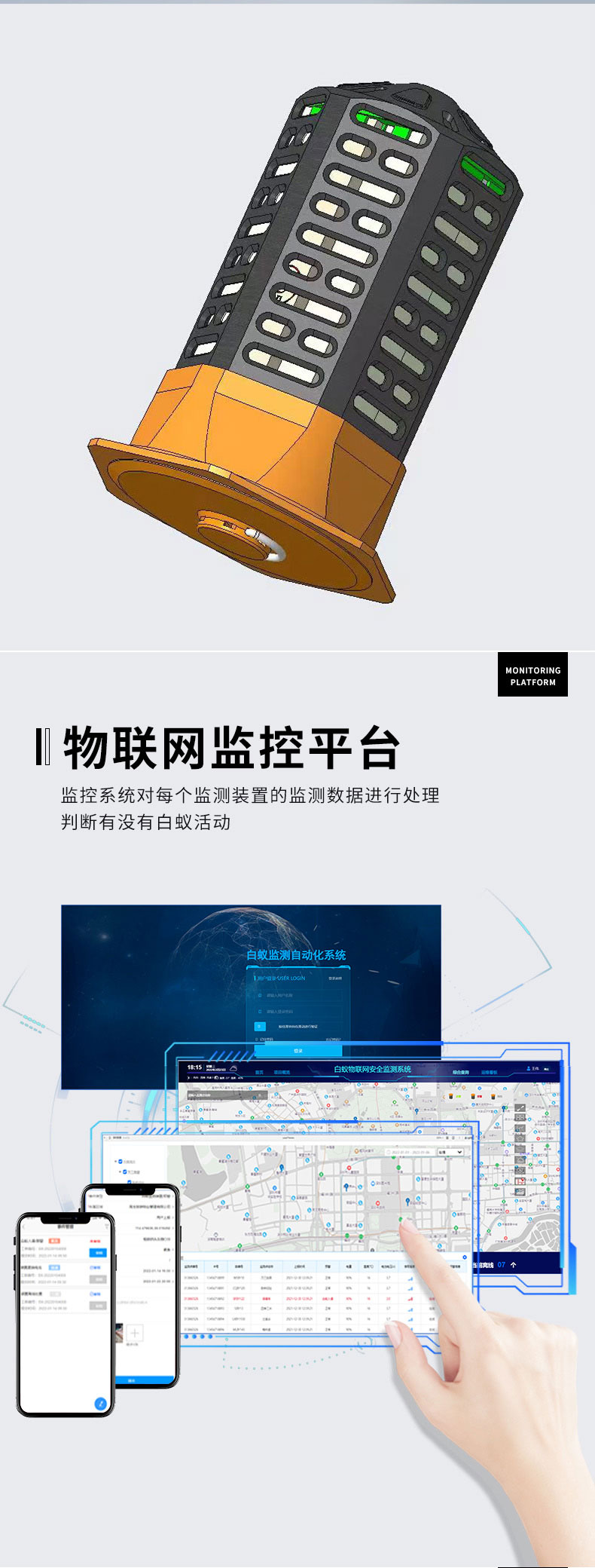 【产品简介】水利地埋型BY2白蚁监测设备原理采用白蚁喜欢吃的食物做诱饵,吸引白蚁取食,取食过程中触动报警装置。报警装置发出信号,通过物联网传输到监控系统,经过数据处理,监测结果呈现给用户。用户···