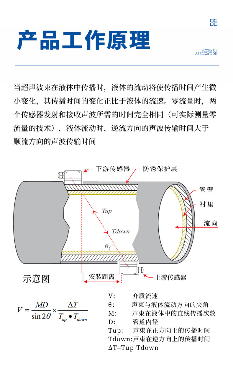 当超声波束在液体中传播时,液体的流动将使传播时间产生微小变化,其传播时间的变化正比于液体的流速。零流量时,两个传感器发射和接收声波所需的时间完全相同(唯一可实际测量零流量的技术),液体流动时,逆流方向的声波传输时间大于顺流方向的声波传输时间。
