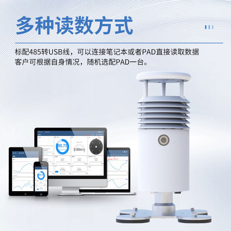 标配485转USB线,可以连接笔记本或者pad直接读取数据。客户可根据自身情况,随机选配pad一台。