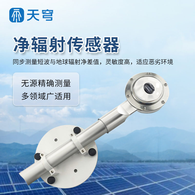 太阳净辐射传感器被用来测量由天空向下投射的和地球表面向上投射的全波段辐射量的净差值。测量范围为0.3~3微米的短波辐射和3~100微米的地球辐射。应用于土壤水分蒸发蒸腾计算、及热平衡相关的建筑机理研究。