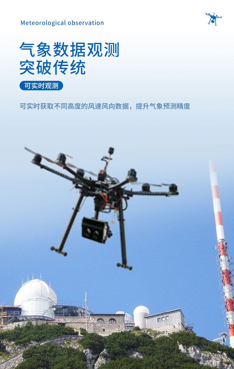 1.无人机风速风向仪仅重680/880克,专为无人飞机或小型无人巡检飞行器空中飞行状态下的能见度及其它气象数据监测和采集而设计;