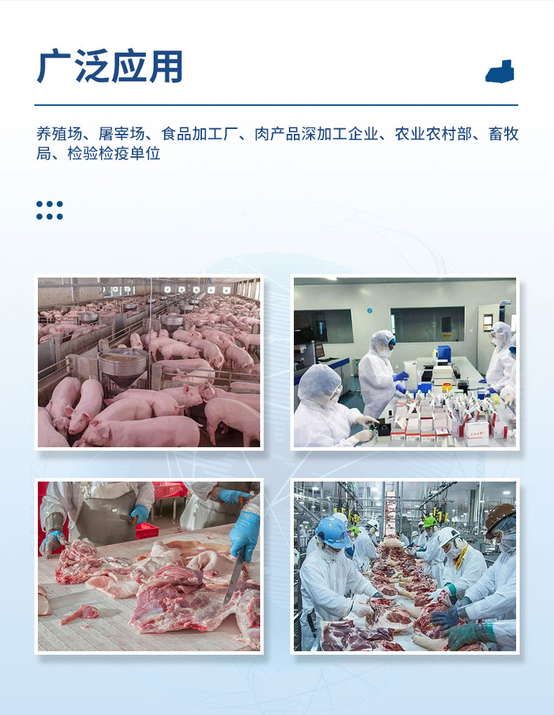 单通道8孔非洲猪瘟检测仪配套非洲猪瘟病毒荧光pcr检测试剂盒、非洲猪瘟病毒荧光pcr核酸检测试剂盒均已经获得农业农村部产品批准,可以满足非洲猪瘟核酸现场快速检测需求。可定量快速畜牧类疾病诊断如非洲猪瘟、禽流感、猪瘟、猪蓝耳、伪狂犬等疾病,广泛应用于养殖场、屠宰场、食品加工厂、肉产品深加工企业、农业农村部、畜牧局、检验检疫单位使用。