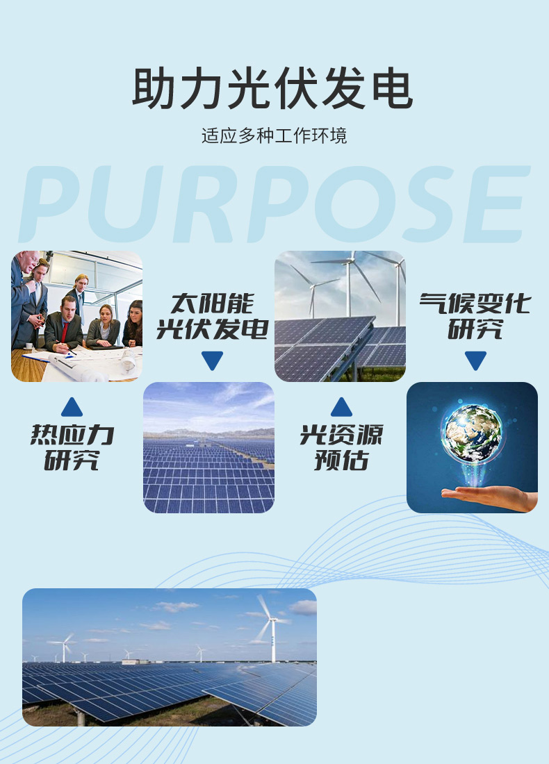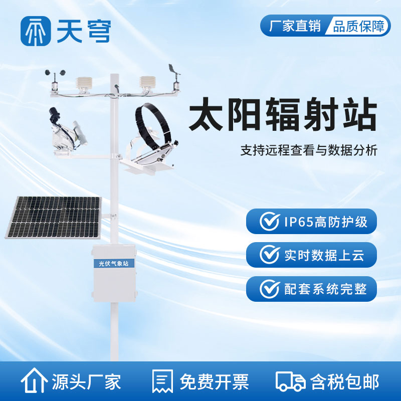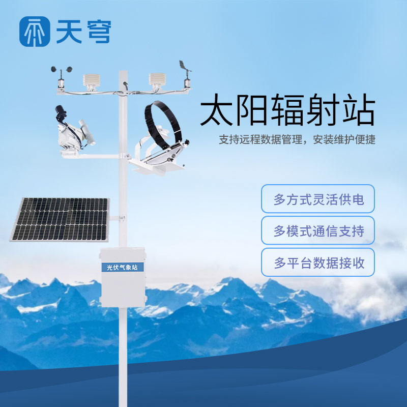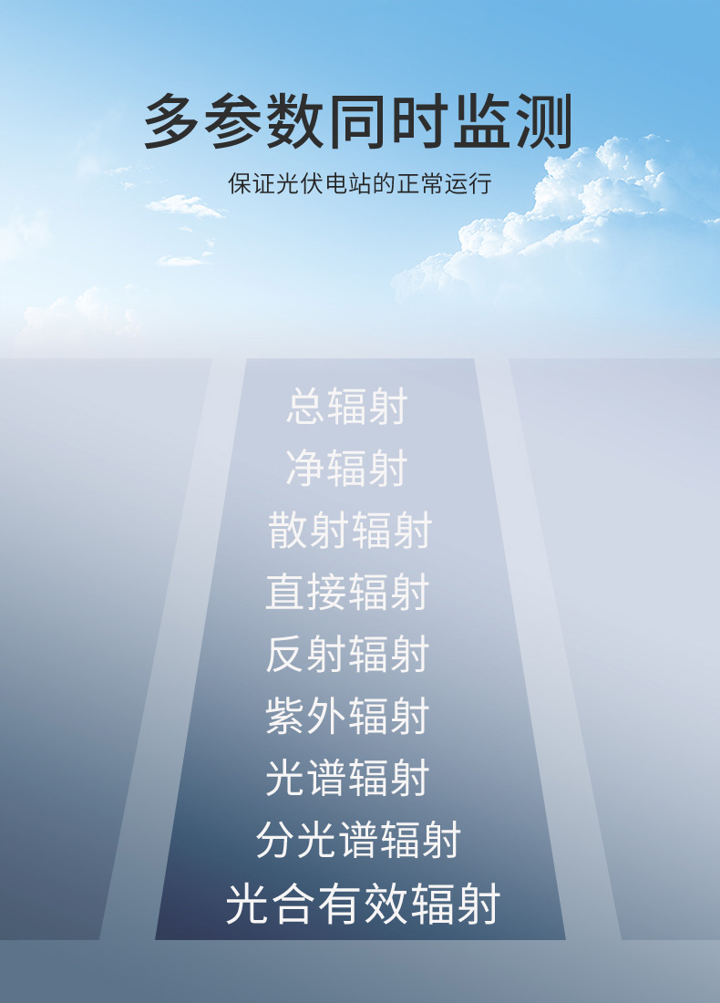 太阳辐射观测站可对太阳的总辐射、散射辐射、直接辐射、反射辐射、净辐射、紫外辐射、光谱辐射、分光谱辐射及光合有效辐射等各种类型的太阳辐射能量数据进行测量,并可将数据实时传输到云平台,方便客户查看以及统计分析。