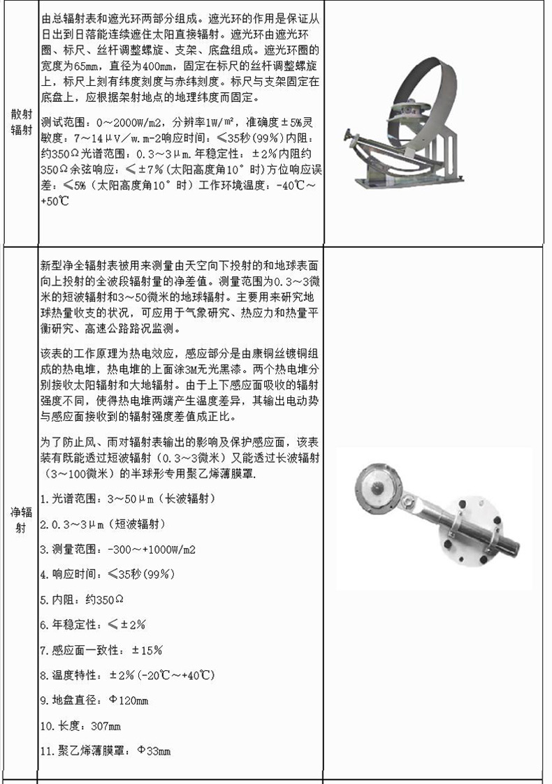 散射辐射 | 由总辐射表和遮光环两部分组成。遮光环的作用是保证从日出到日落能连续遮住太阳直接辐射。遮光环由遮光环圈、标尺、丝杆调整螺旋、支架、底盘组成。遮光环圈的宽度为65mm,直径为400mm,固定在标尺的丝杆调整螺旋上,标尺上刻有纬度刻度与赤纬刻度。标尺与支架固定在底盘上,应根据架射地点的地理纬度而固定。 测试范围:0~2000W/m2,分辨率1W/㎡,准确度±5%灵敏度:7~14μV/w.m-2响应时间:≤35秒(99%)内阻:约350Ω光谱范围:0.3~3μm.年稳定性:±2%内阻约350Ω余弦响应:≤±7%(太阳高度角10°时)方位响应误差:≤5%(太阳高度角10°时)工作环境温度:-40℃~+50℃ |