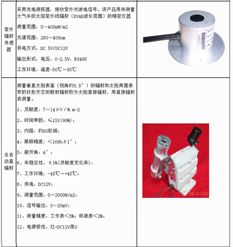全自动直辐射 | 测量垂直太阳表面(视角约0.5°)的辐射和太阳周围很窄的环形天空的散射辐射称为太阳直接辐射,用直接辐射表测量。 1、灵敏度:7~14μV∕W.m-2 2、时间常数:≤15S(99%); 3、内阻:约80欧姆; 4、跟踪精度:<168h±1°; 5、敞开角:4°; 6、年稳定性:±1%(灵敏度变化率); 7、工作环境:-45℃~+45℃; 8、供电:DC12V; 9、测量范围:0~2000W/m2; 10、信号输出:0~20mV; 11、测量精度:工作表<5%;标准表<2%; 12、电源极性:红+DC12V黑0 |