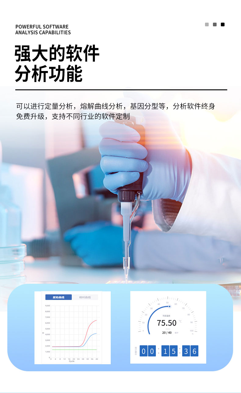 8、强大的软件分析功能,可以进行定量分析,熔解曲线分析,基因分型等,分析软件终身免费升级,支持不同行业的软件定制;