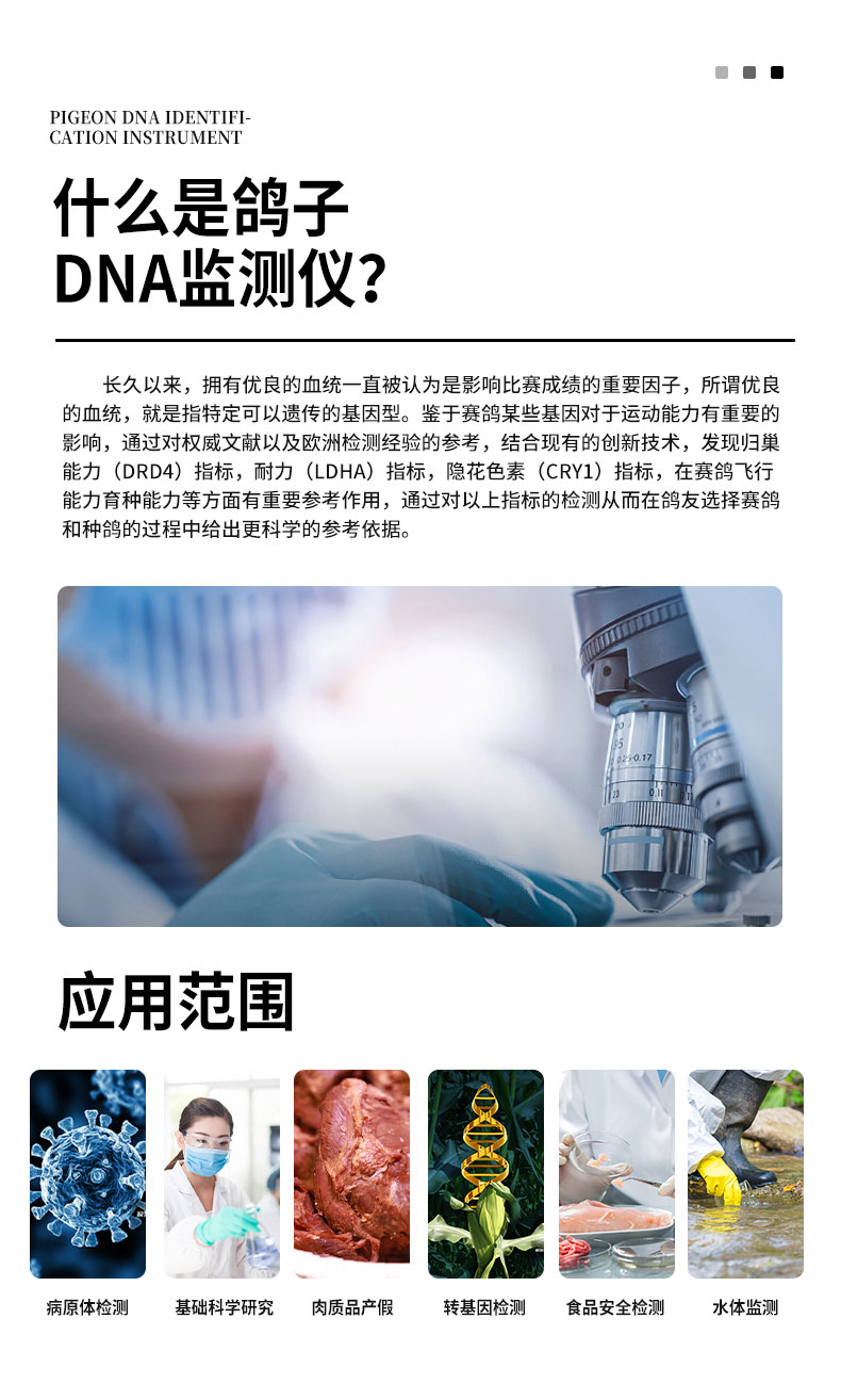 长久以来,拥有优良的血统一直被认为是影响比赛成绩的重要因子,所谓优良的血统,就是指特定可以遗传的基因型。鉴于赛鸽某些基因对于运动能力有重要的影响,通过对权威文献以及欧洲检测经验的参考,结合现有的创新技术,发现归巢能力(DRD4)指标,耐力(LDHA)指标,隐花色素(CRY1)指标,在赛鸽飞行能力育种能力等方面有重要参考作用,通过对以上指标的检测从而在鸽友选择赛鸽和种鸽的过程中给出更科学的参考依据。