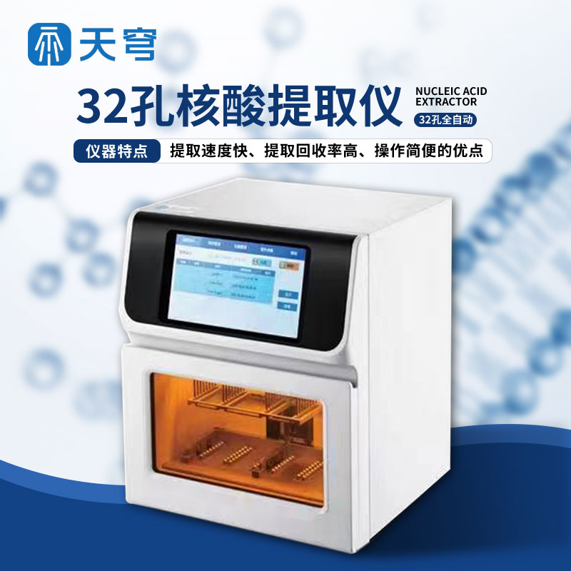 32孔位32孔核酸提取仪通过磁珠法提取核酸,选择相应的试剂盒就可以自动的从多种样品材料如血液、组织、细胞中分离纯化高纯度的核酸。具有兼容性强(适配32头份提取试剂,也可适配单头份试剂)、提取速度快、提取回收率高、操作简便的优点,是分子生物学实验室检测试验的得力“助手”。可广泛应用于科学研究、分子诊断、动植物疫病检测等领域。