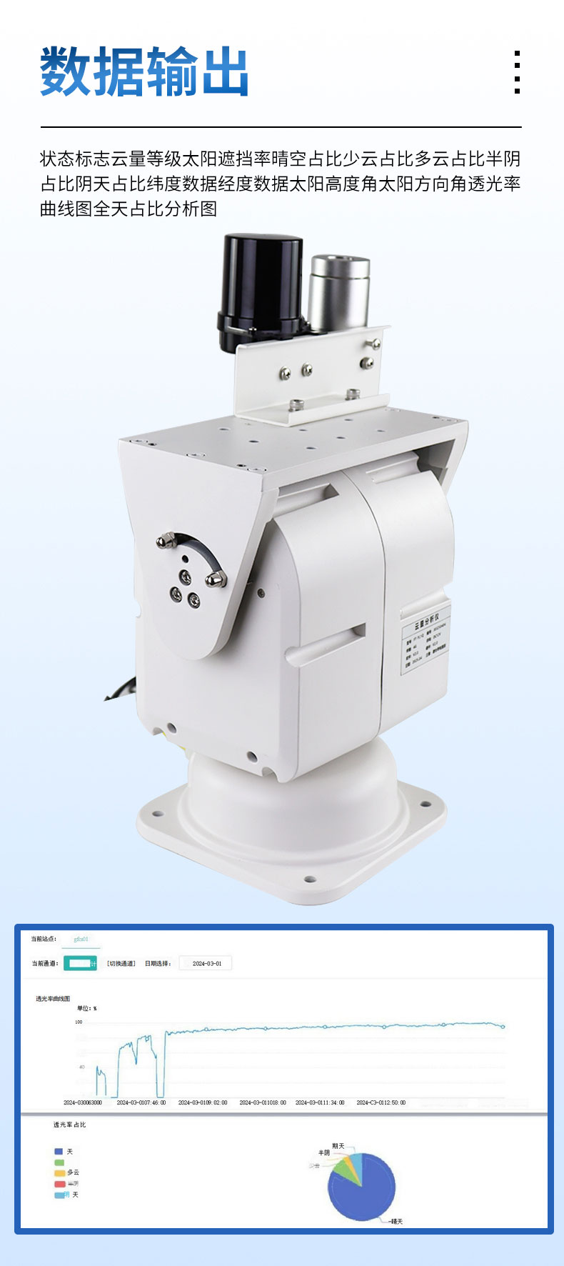 云量分析仪利用先进的机器学习技术和尖端的大模型算法,结合专业的光学传感技术,能够精确计算天空中的云量及太阳光透过云层的比例,提供比传统方法更为精确的数据。