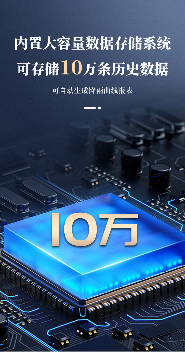 10、内置大容量数据存储系统,最多可存储10万条历史数据,可自动生成降雨曲线报表。