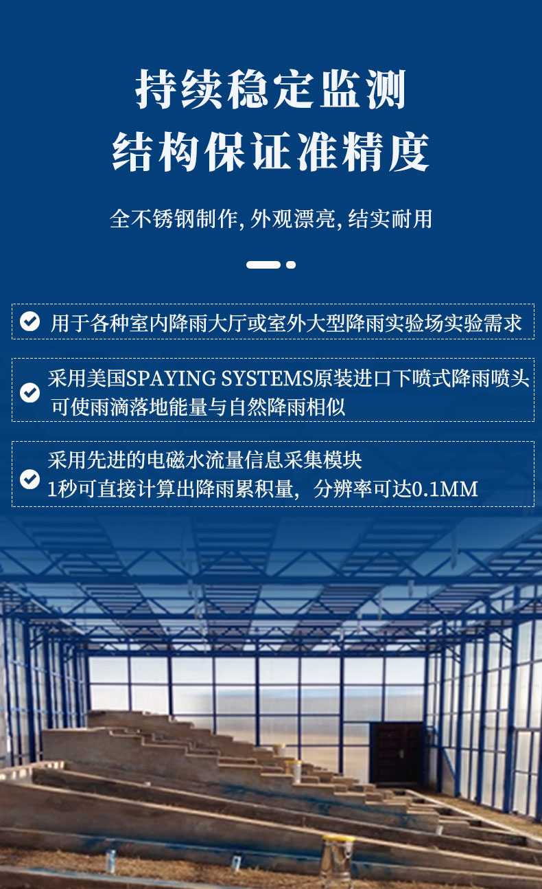 1、主要用于各种室内降雨大厅或室外大型降雨实验场实验需求。