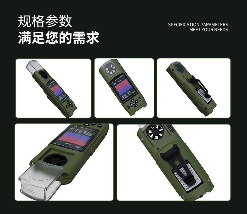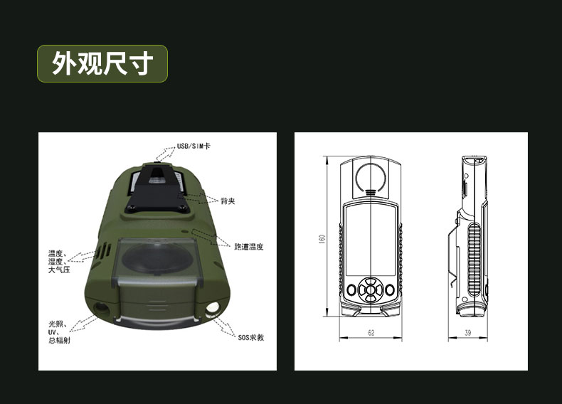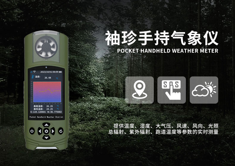 【产品简介】一、袖珍手持气象仪产品简介本产品提供温度、湿度、大气压、风速、风向、光照、总辐射、紫外辐射、跑道温度等参数的实时测量。并具备户外的SOS求救、电子罗盘、跑道温度、未来3小时天气预报···