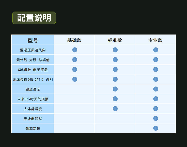 并具备户外的SOS求救、电子罗盘、跑道温度、未来3小时天气预报、人体舒适度、无线电静默、GNSS定位等功能。