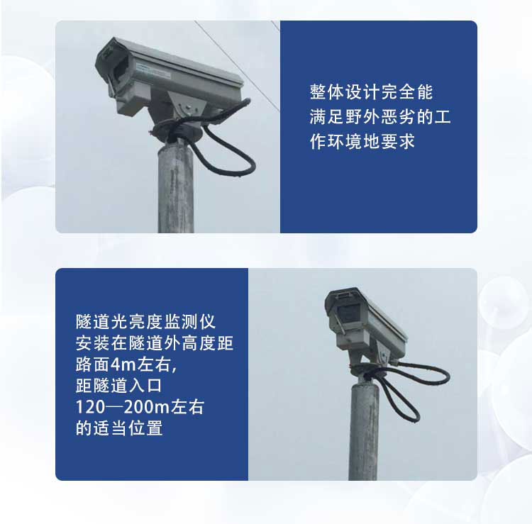 隧道光强度监测仪安装在隧道内指定区域的墙壁上,为了避免因事故或汽车残骸对其的损伤,需安装在4m左右的高度,距隧道入口大于10m的适当位置。隧道洞外亮度检测器安装在隧道外高度距路面4m左右,距隧道入口120—200m左右的适当位置。具有高可靠性和低维护量.最新微处理器技术,完全数字化运行,安装调试简易。