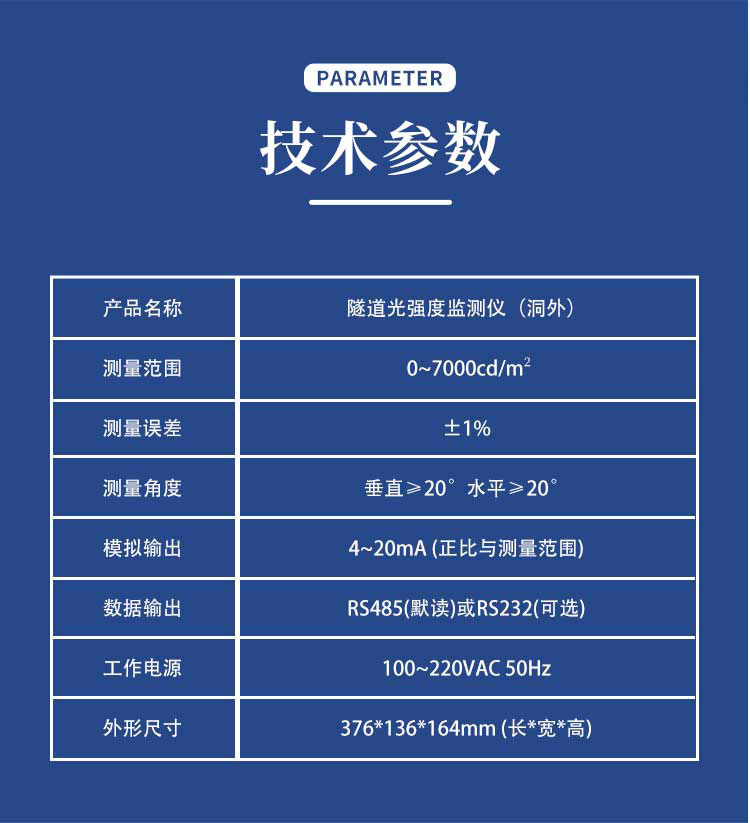 隧道洞外亮度检测器能完全满足整个隧道照明控制的要求,预置控制模式的控制器根据光源测量值按预设参数自动进行切换照明开关,为隧道照明提供了最佳值。它的设计完全符合CIE关于隧道照明测量的要求,并能满足《公路隧道通风照明设计规范》,而且它的整体设计完全能满足野外恶劣的工作环境地要求。
