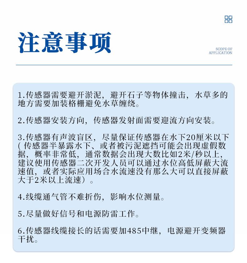 1.传感器需要避开淤泥,避开石子等物体撞击,水草多的地方需要加装格栅避免水草缠绕。