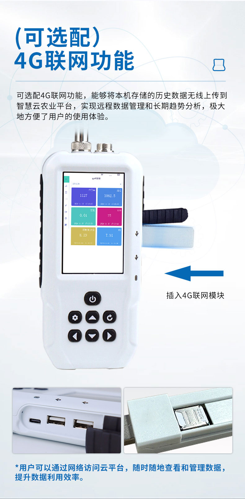 6.无线上传至云平台:可选配4G联网功能,能够将本机存储的历史数据无线上传到智慧云农业平台,实现远程数据管理和长期趋势分析,极大地方便了用户的使用体验。