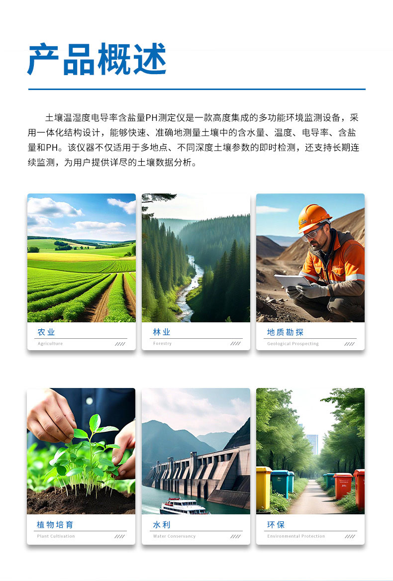广泛应用于农业、林业、地质勘探、植物培育、水利、环保等多个行业。它为土壤墒情检测、旱作节水灌溉、精细农业等领域提供了科学依据和技术支持,帮助用户更好地理解和优化土壤条件,促进可持续发展实践。