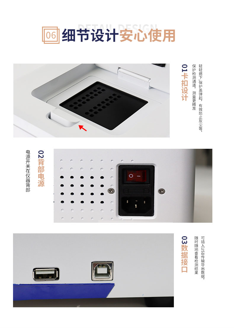 B免维护的灵敏光学系统:配备4个独立LED光源与4个独立光电二极管检测器,实现四通道荧光同步精准检测。采用超长寿命进口光源,设计寿命期内免维护,无需额外校准或更换,保障检测结果长期一致性与高灵敏度。