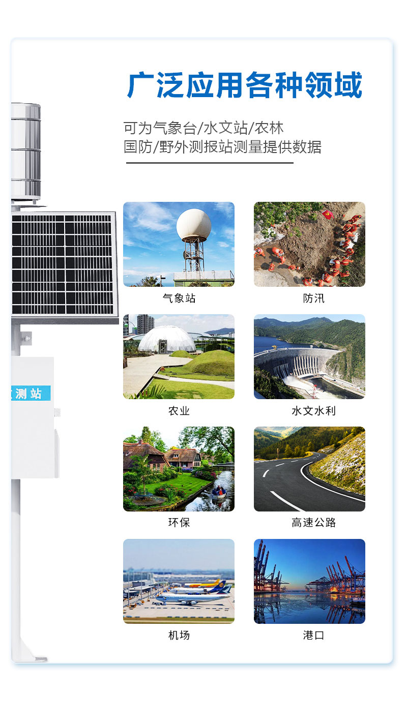 翻斗式雨量监测站可广泛地应用于气象、防汛、农业、水文水利、环保、高速公路、机场和港口等领域。既可为气象台(站)、水文站、农林、国防、野外测报站等有关部门测量降水量、降水强度、降水时间等参数提供原始数据;也可为防洪、供水调度、电站、水库水情管理提供有参考价值的实时数据。