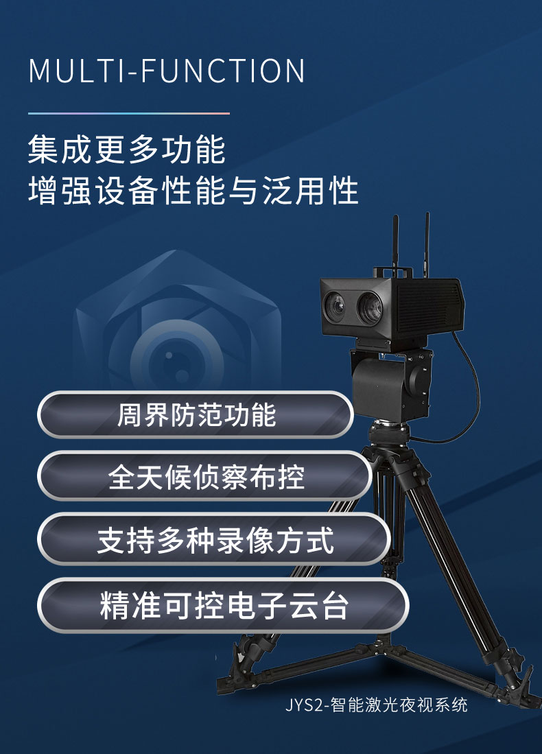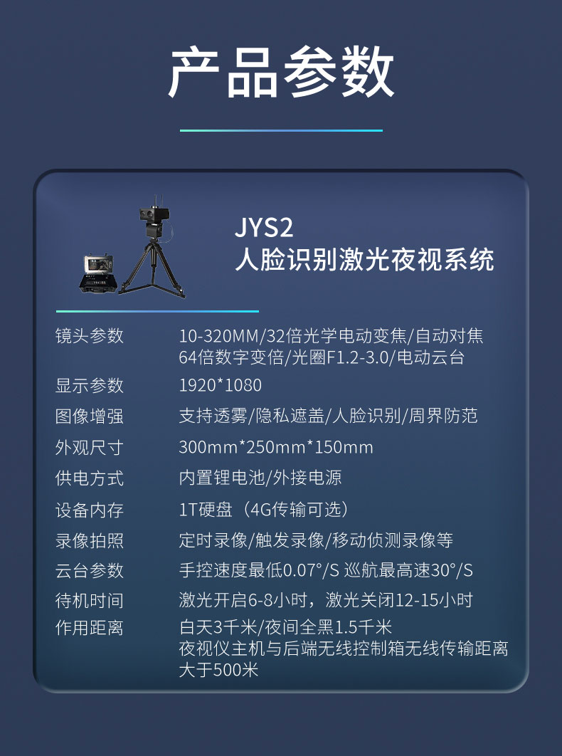 可视距离夜间最远监控距离1500米以上,白天最远监控距离3000米以上,侦查端采用无红曝或微红曝远距离监控器,带超精准电动云台,夜视仪主机与后端无线控制箱无线传输距离不小于500米,方便远距离遥控操作