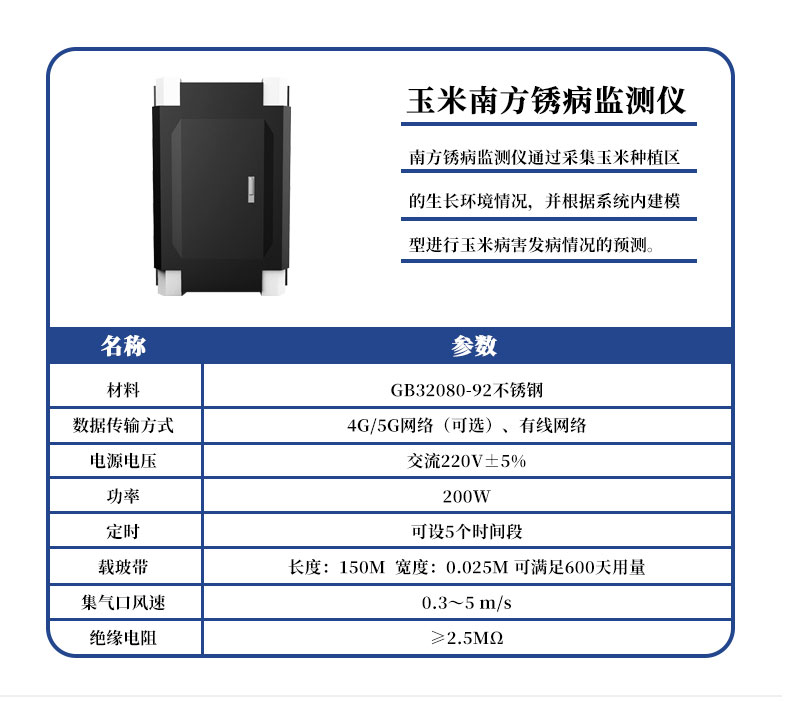 【产品简介】一、玉米南方锈病监测仪产品描述玉米南方锈病监测仪通过采集玉米种植区的生长环境情况,并根据系统内建模型进行玉米病害发病情况的预测。同时内置的孢子捕捉装置通过采集孢子存量及其扩散动态,···